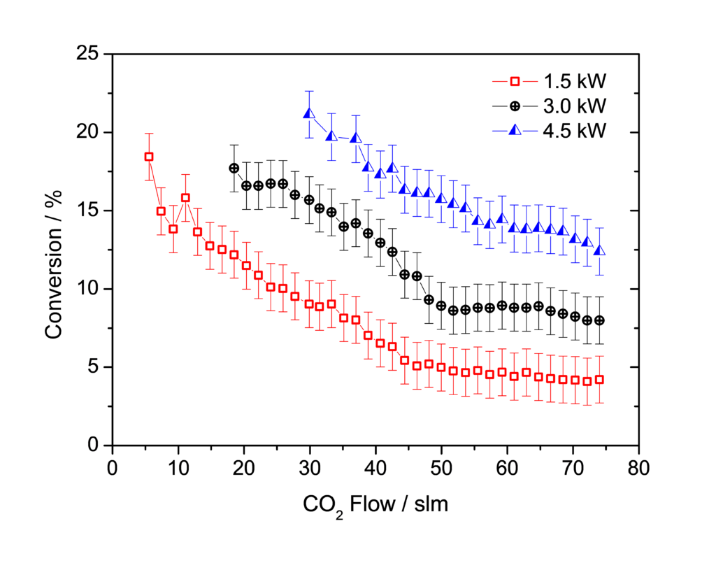 The Institute of Interfacial Process Engineering and Plasma Technology (IGVP) of the University of Stuttgart has developed an atmospheric microwave plasma torch [1] that converts CO2 into CO using renewable electricity. The IGVP performed energy efficiency studies of the CO2 plasma conversion [2]. Operating at a frequency of 2.45 GHz, the system is scaled up to a magnetron with a nominal power of 6 kW and can handle CO2 flow rates of up to 74 standard liters per minute (slm) [3]. The influence of the flow rate at three different microwave powers is shown in graphic 1. The conversion graph (left) demonstrates the conversion rate decreases as the CO2 flow rate increases, but improves with higher microwave power. In contrast, energy efficiency increases with higher flow rates. At elevated flow rates, the conversion rises linearly with microwave power, which keeps the energy efficiency constant. This operating point is particularly suitable for flexible power inputs from renewable sources and allows for maximum energy efficiency.
