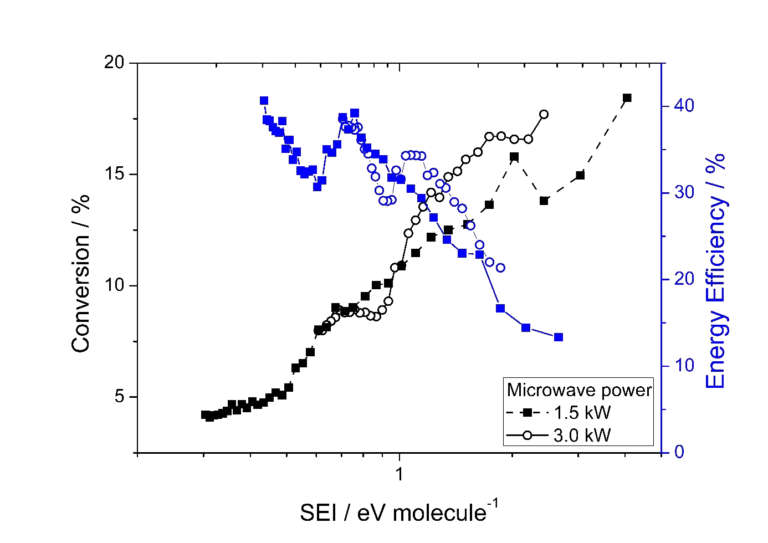 This process achieved a maximum conversion of 21 % at a specific energy input (SEI) of 1.1 eV molecule−1 with a microwave power of 4.5 kW [3]. The SEI is the ratio of microwave power to CO2 gas flow. The maximum energy efficiency of 40 % was found at gas flow rates of over 65 slm [3]. The process reveals a clear trade-off: high conversion rates are achieved at high SEI values, while high energy efficiency occurs at lower SEI values [3]. This behavior is illustrated in graphic 2 for microwave powers of 1.5 kW and 3 kW. This behavior was found to be independent of microwave power. As a result, the system can be flexibly operated in either a conversion-focused or an efficiency-focused mode, depending on the energy input.
