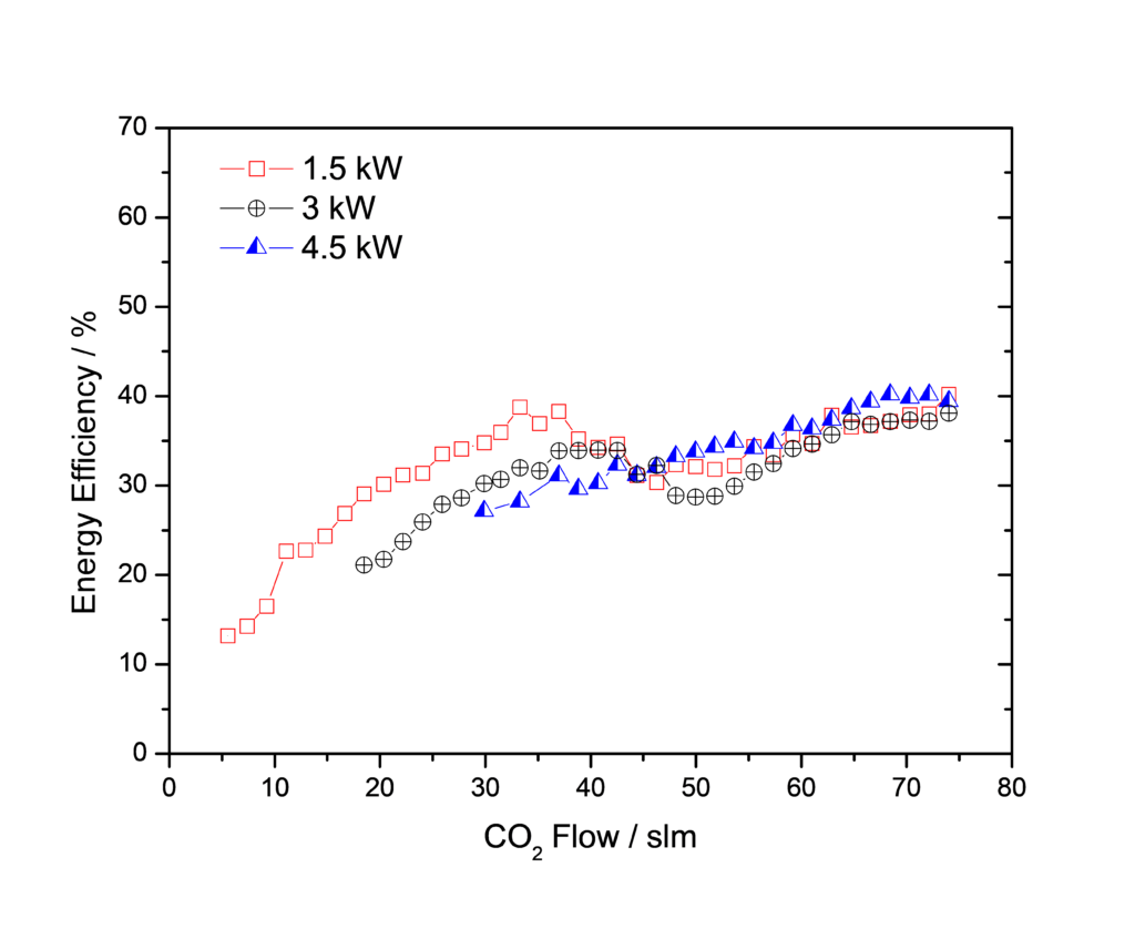 Influence of CO2 flow rate is shown against conversion (left) and energy efficiency (right)